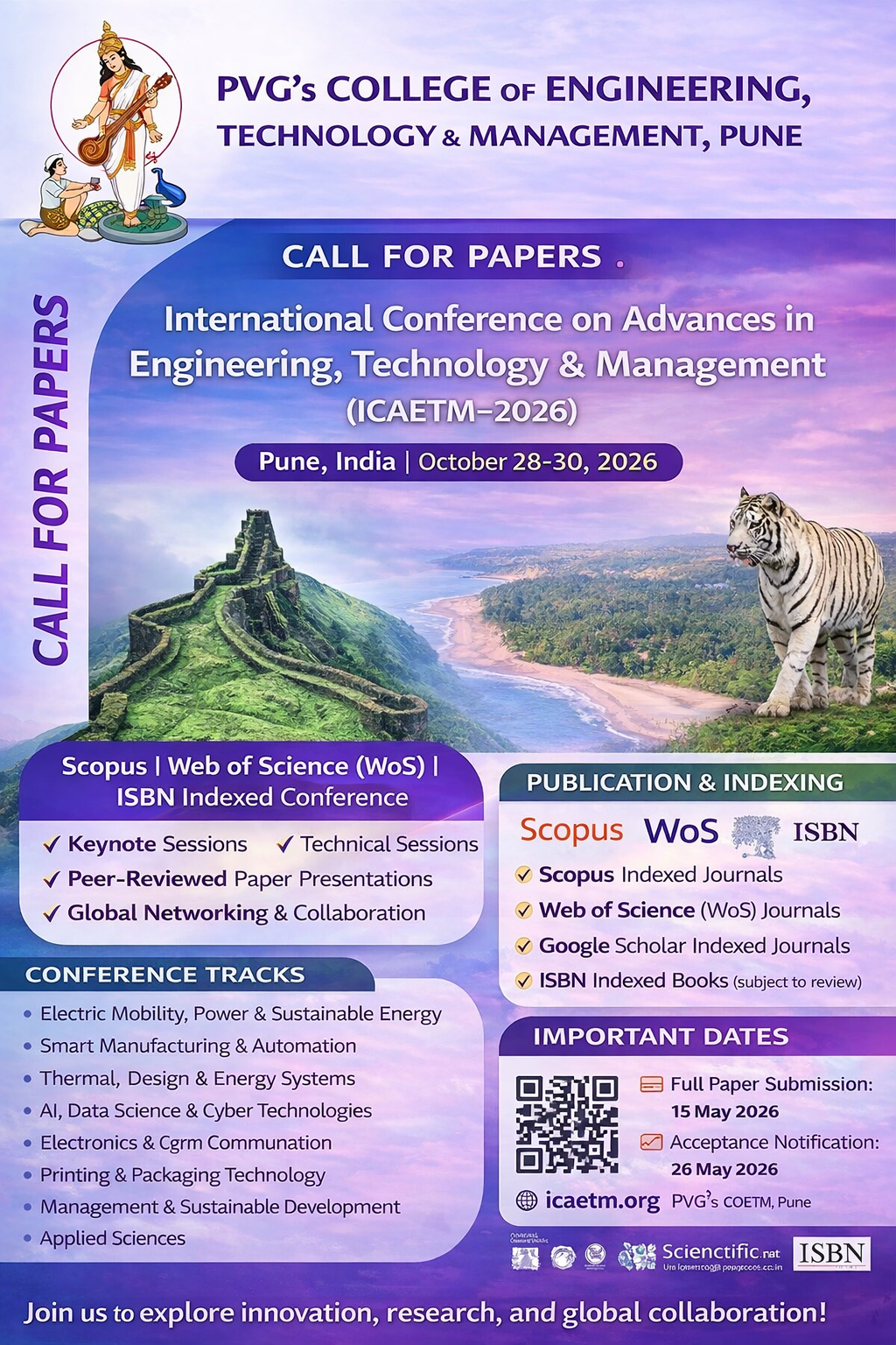 The International Conference on Advances in Engineering, Technology, and Management (ICAETM-2026), organized by PVG’s COETM, Pune, aims to bring together academicians, researchers, industry experts, and students on a common global platform. The conference focuses on recent innovations, interdisciplinary research, and sustainable engineering solutions across diverse domains. ICAETM-2026 will feature keynote talks, technical sessions, and peer-reviewed paper presentations, with selected papers considered for publication in reputed Scopus-indexed journals/proceedings, fostering knowledge exchange and global collaboration.